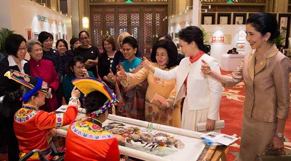 彭麗媛和來賓們對殘疾人們身殘志堅的意志力表示欽佩,對他們的作品也非常喜愛。看到泰國總理夫人娜拉蓬很喜歡陶塑,彭麗媛拿起一尊作品和她一起細(xì)細(xì)欣賞。康志敏告訴他們,這個作品名叫《母愛》,并熱情地提議將它送給娜拉蓬做禮物。娜拉蓬高興地收下了這份珍貴的禮物。