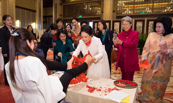 剪紙展臺前,夫人們對剪紙姑娘夏紅的“心靈足巧”佩服不已。彭麗媛拿起夏紅剪出的一張張大紅福字送給夫人們,告訴大家“這代表著歡樂和幸福”。彭麗媛還接過夏紅用腳遞來的剪紙“和平鴿與愛心”,展示給夫人們看。夫人們應(yīng)邀拿起剪刀一試身手。加拿大總理夫人勞琳很快剪出了一只蝴蝶,夫人們紛紛為她鼓掌。