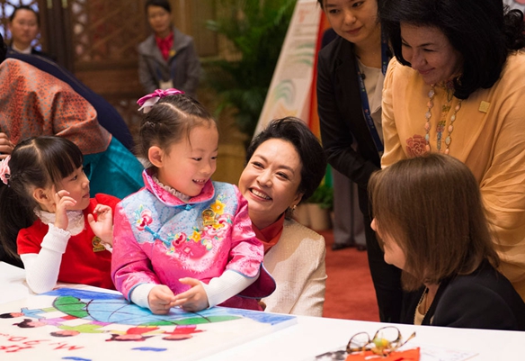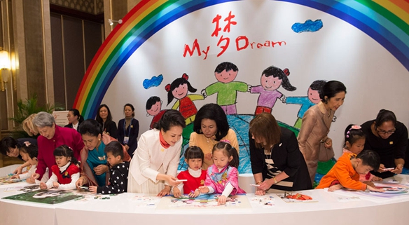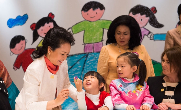 看到彭麗媛和夫人們的到來,孩子們很高興,笑著喊道“阿姨好!”彭麗媛和夫人們也笑著回應(yīng),走進孩子們中間。