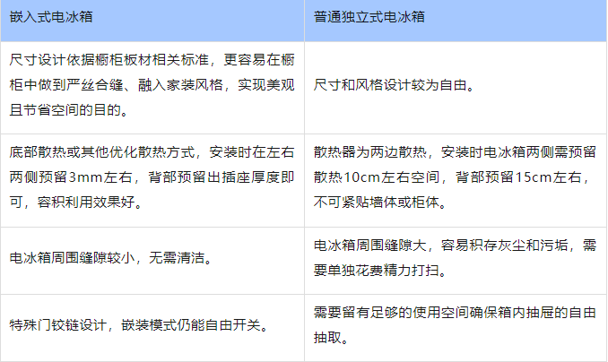 嵌入式電冰箱和普通獨(dú)立式電冰箱差異見下表: