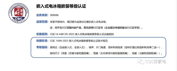 該項(xiàng)目依據(jù)能耗比、噪聲、容積利用效果、結(jié)構(gòu)尺寸和開門角度等指標(biāo),綜合考核電冰箱嵌入效果并進(jìn)行等級(jí)認(rèn)證。符合不同嵌裝等級(jí)要求的產(chǎn)品都將獲頒認(rèn)證證書(嵌裝等級(jí)會(huì)體現(xiàn)在認(rèn)證證書中),同時(shí)產(chǎn)品可加貼“好家電”標(biāo)志。