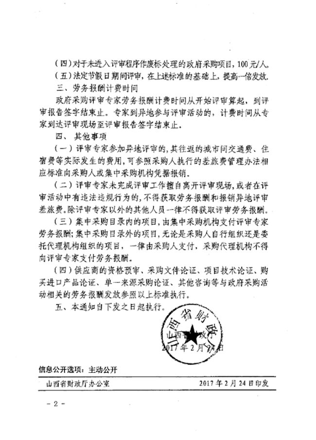 山西省財(cái)政廳關(guān)于規(guī)范政府采購(gòu)評(píng)審專家勞務(wù)報(bào)酬標(biāo)準(zhǔn)的通知