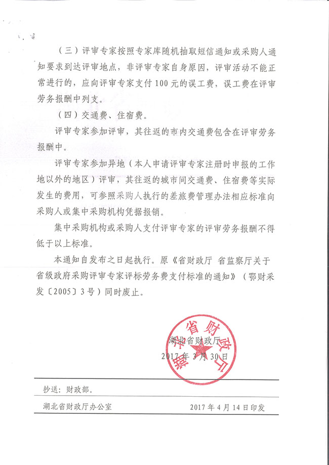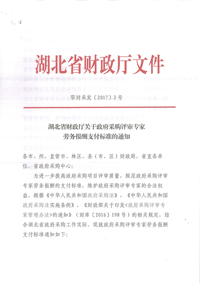 湖北省財政廳關于政府采購評審專家勞務報酬支付標準的通知