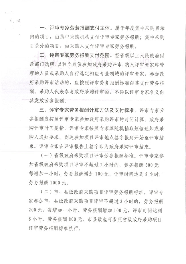 ?。ǘ┦小⒖h級政府采購項目評審勞務報酬標準。評審專家參加市、縣級政府采購項目評審不超過2小時的,勞務報酬200元,每增加一小時,勞務報酬增加100元,評審時間達到8小時,勞務報酬800元。市縣級也可參照省級政府采購項目評審勞務報酬標準執行。